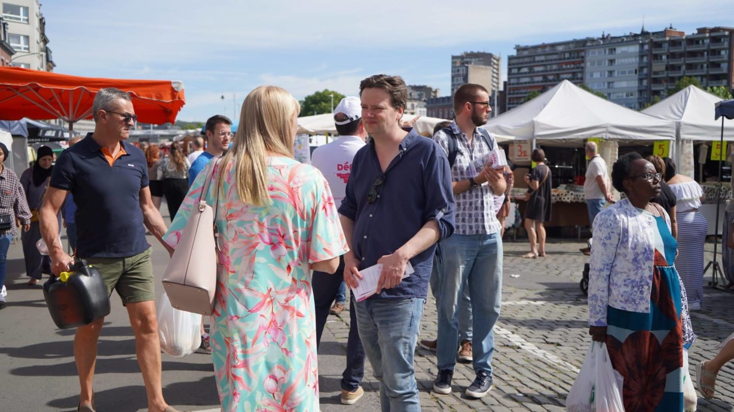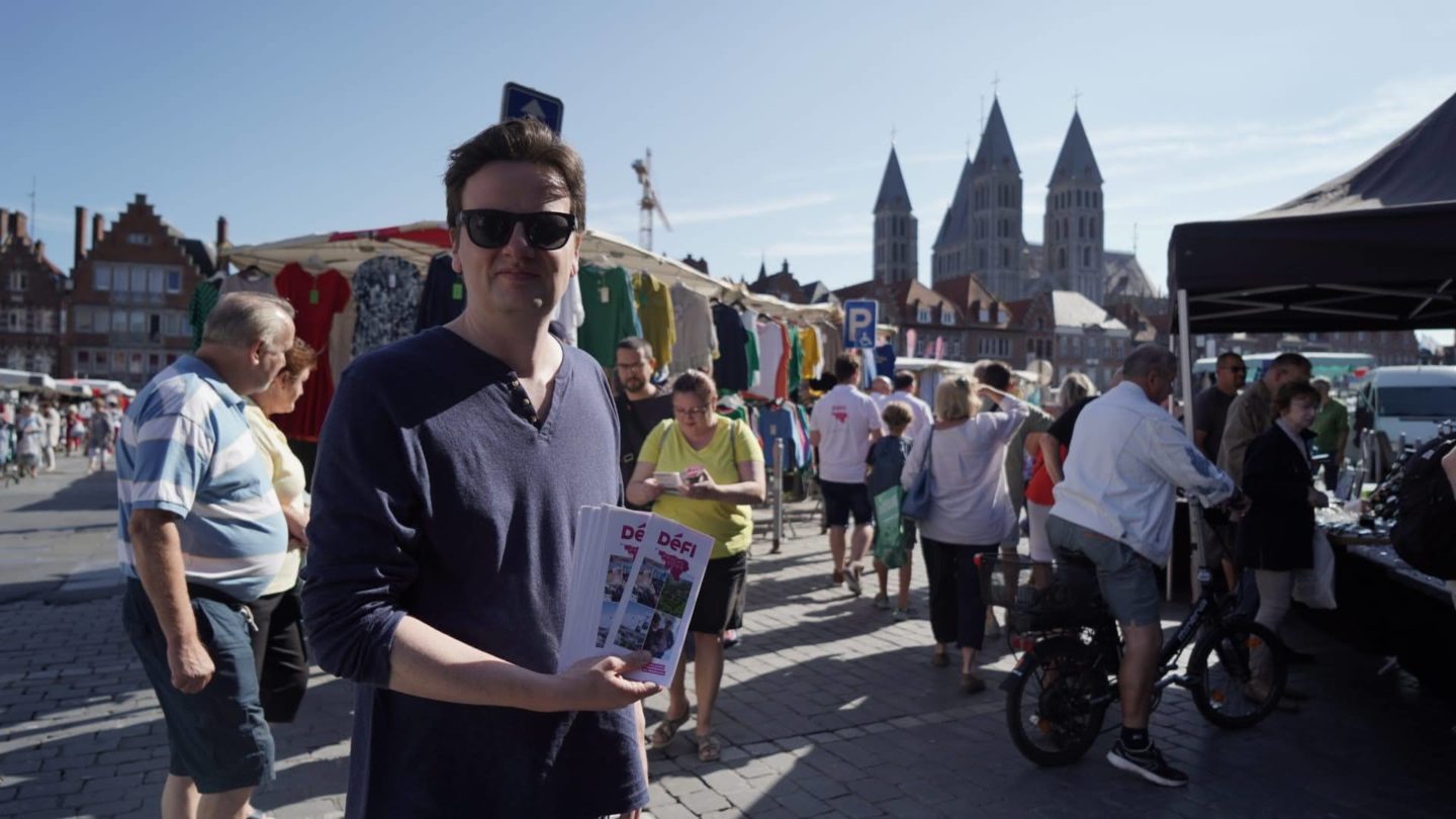 Direction ensuite le Nautisport centre sportif pour mettre en lumière les difficultés que rencontrent toutes les communes dans la gestion financière des bâtiments sportifs. Après s’être essayé au hockey et d’avoir regardé un peu le tournoi de foot, il est temps de se diriger vers le marché de Tournai où nous recevons un bon accueil sous un soleil radieux et avec la présence du Président de Wallonie Picarde Emmanuel Cornette.